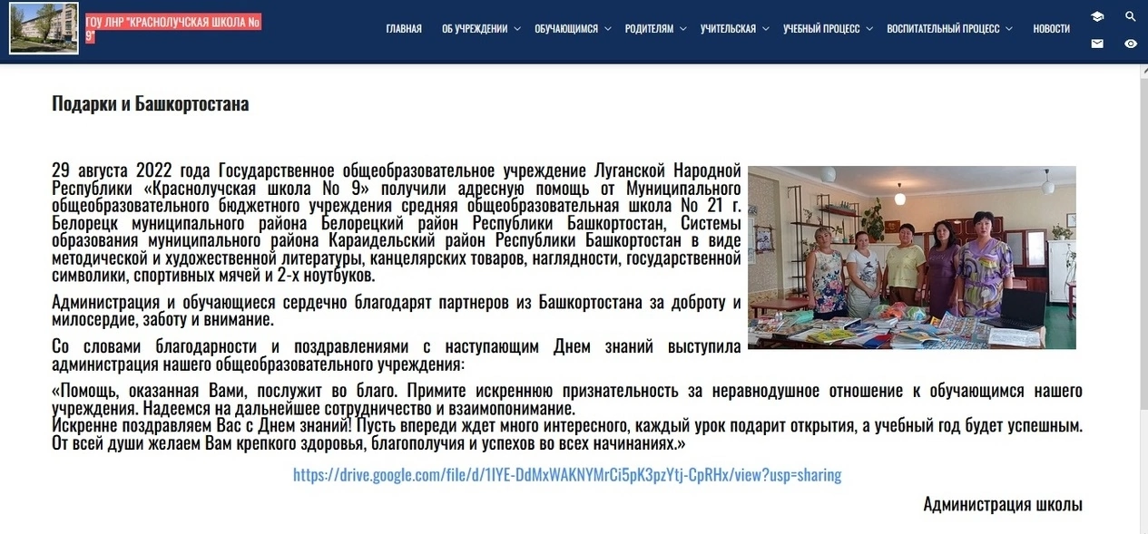 Наша школа начала сотрудничать с ГОУ ЛНР "Краснолучская школа №9" г. Красный Луч